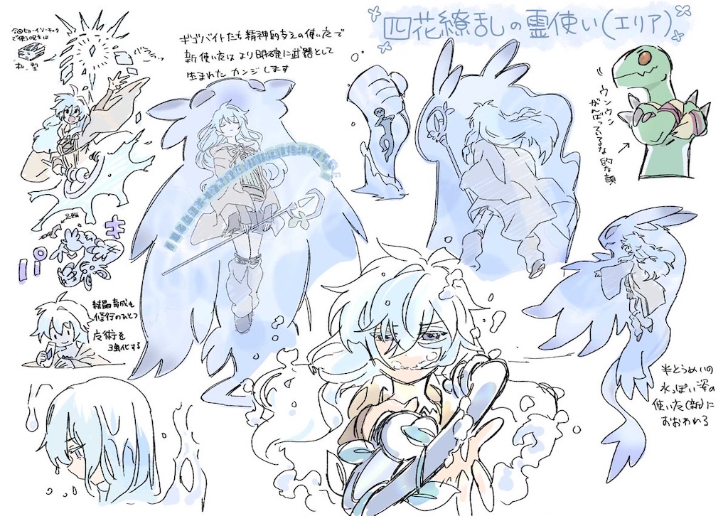 新しい設定画が公開されましたねー。今回は 『四花繚乱の霊使い』に描かれている内の1人、『水霊使いエリア』。札型の呪文と魔術を強化する結晶を用いて使い魔を強化した姿ですね。全身を水っぽい使い魔で覆って守りつつ攻撃も出来ると攻防一体の魔法になっている。この強化された使い魔は 『憑依装着』や『霊使い』、『霊媒師』の時にそばにいたギゴバイトではなく 『清冽の水霊使いエリア』の時に手に入れた物ですね。他の【霊使い】もリンク2の時に隣にいた使い魔が姿を変えた感じになっている。足の拘束具に関しても『清冽の水霊使いエリア』の時の使い魔をよくよく見てみればちゃんと付いていると細かいですね。この拘束具に関しては 『崔嵬の地霊使いアウス』や『蒼翠の風霊使いウィン』、『火霊媒師ヒータ』でも確認出来ます。 【憑依覚醒】のように使い魔のパワーアップは構想として元々あったのかも。